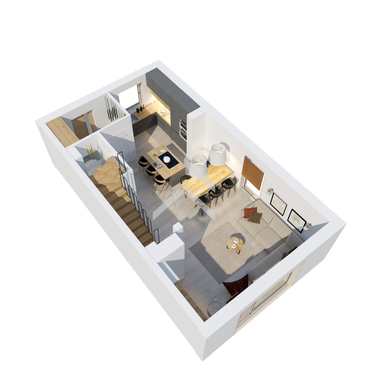 - Parter: salon z jadalnią (31 m²), aneks kuchenny (7,69 m²), wiatrołap (4 m²), WC (2,39 m²), klatka schodowa (3,59 m²).