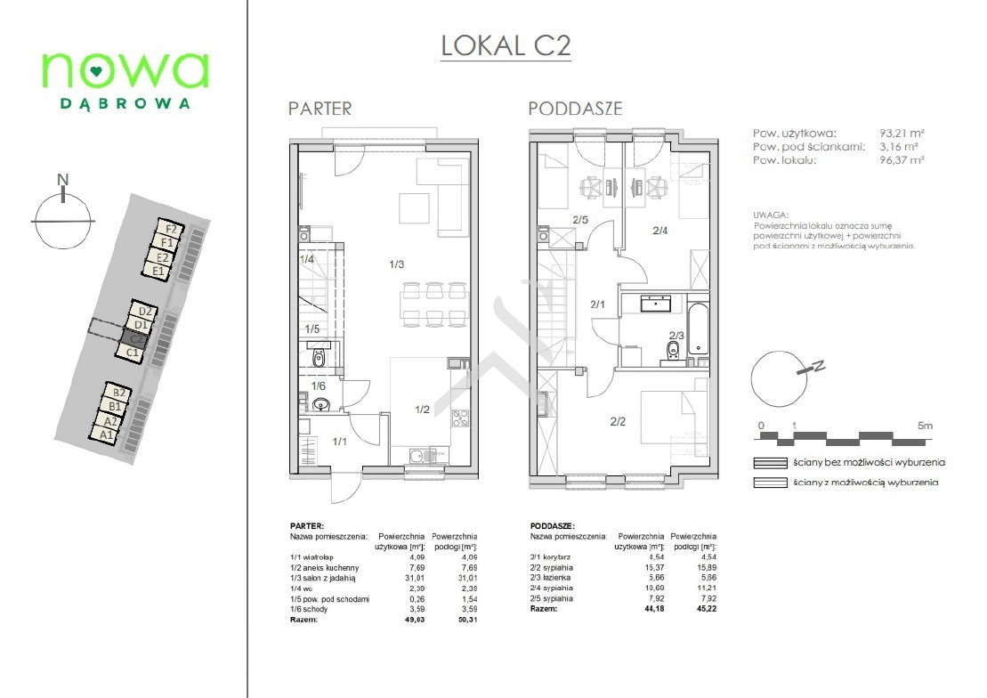 Domy są dwukondygnacyjne (parter + piętro) o powierzchni użytkowej 93,21 m². Dodatkowym atutem jest poddasze nieużytkowe o powierzchni ok. 21 m² z możliwością adaptacji na piąty pokój, gabinet lub strefę rekreacyjną. Do lokali skrajnych przynależą ogródki o powierzchni ok. 170 m², natomiast do lokali środkowych ogródki o powierzchni ok. 70 m².