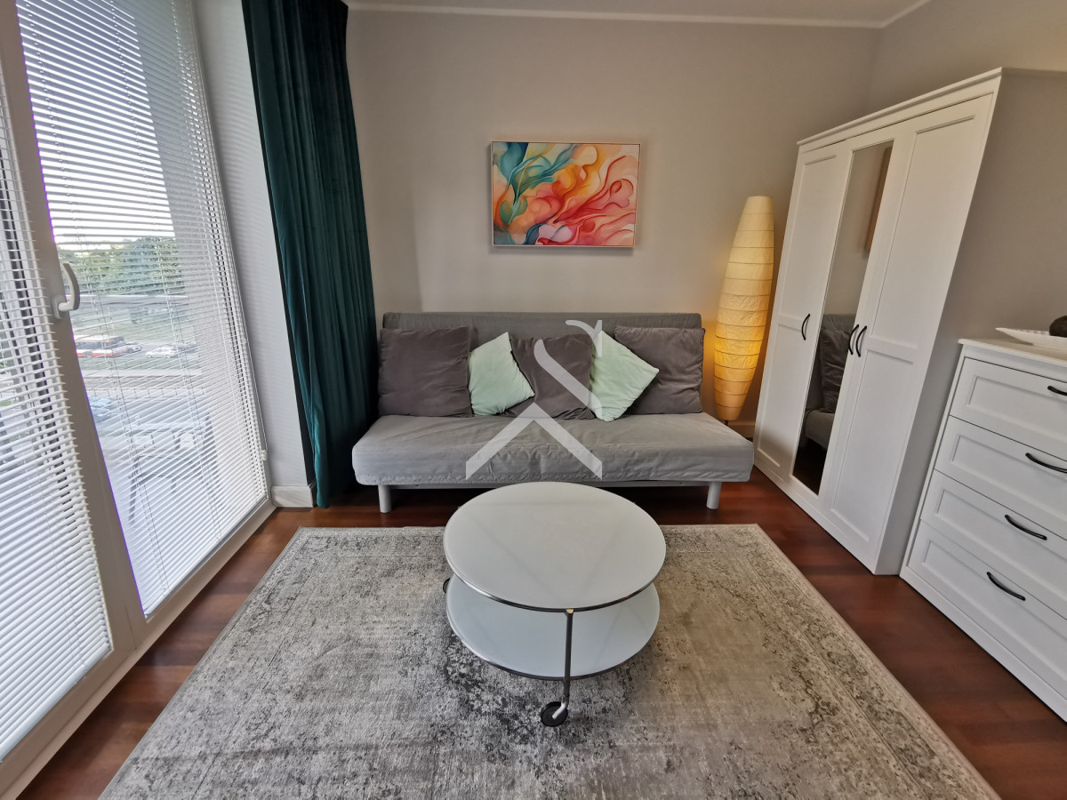 Przestronny salon z dużym oknem i wyjściem na balkon, TV, internet, rozkładana kanapa, szafa, komoda.