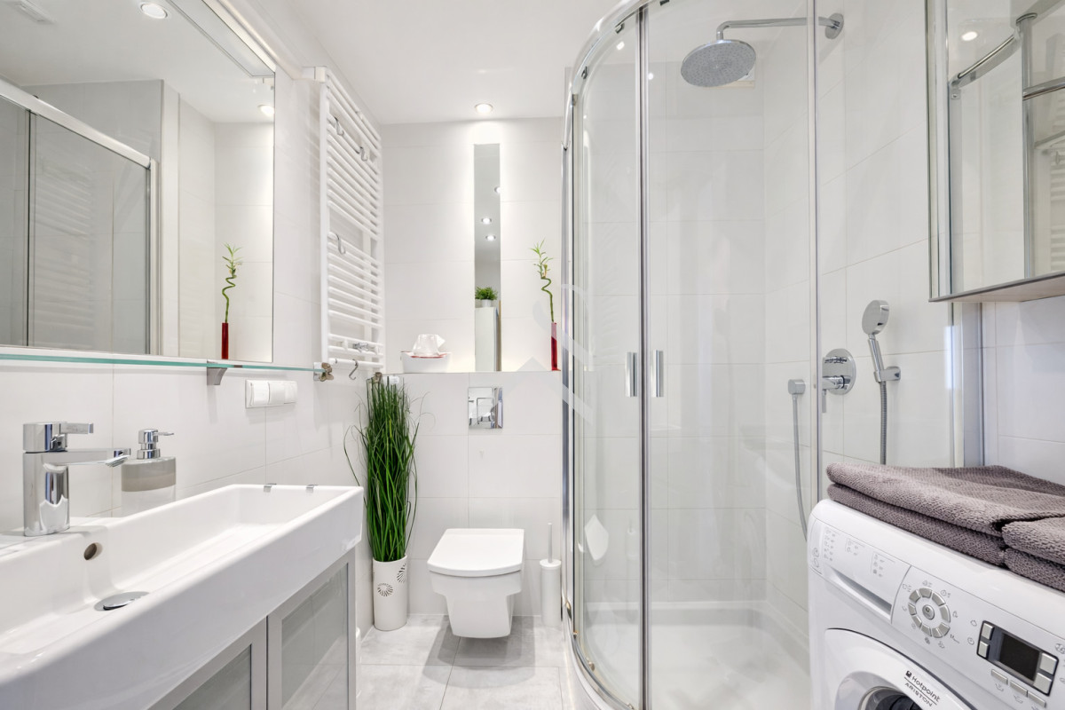 Łazienka w nowoczesnej aranżacji z prysznicem, pralką oraz podgrzewaniem podłogowym.