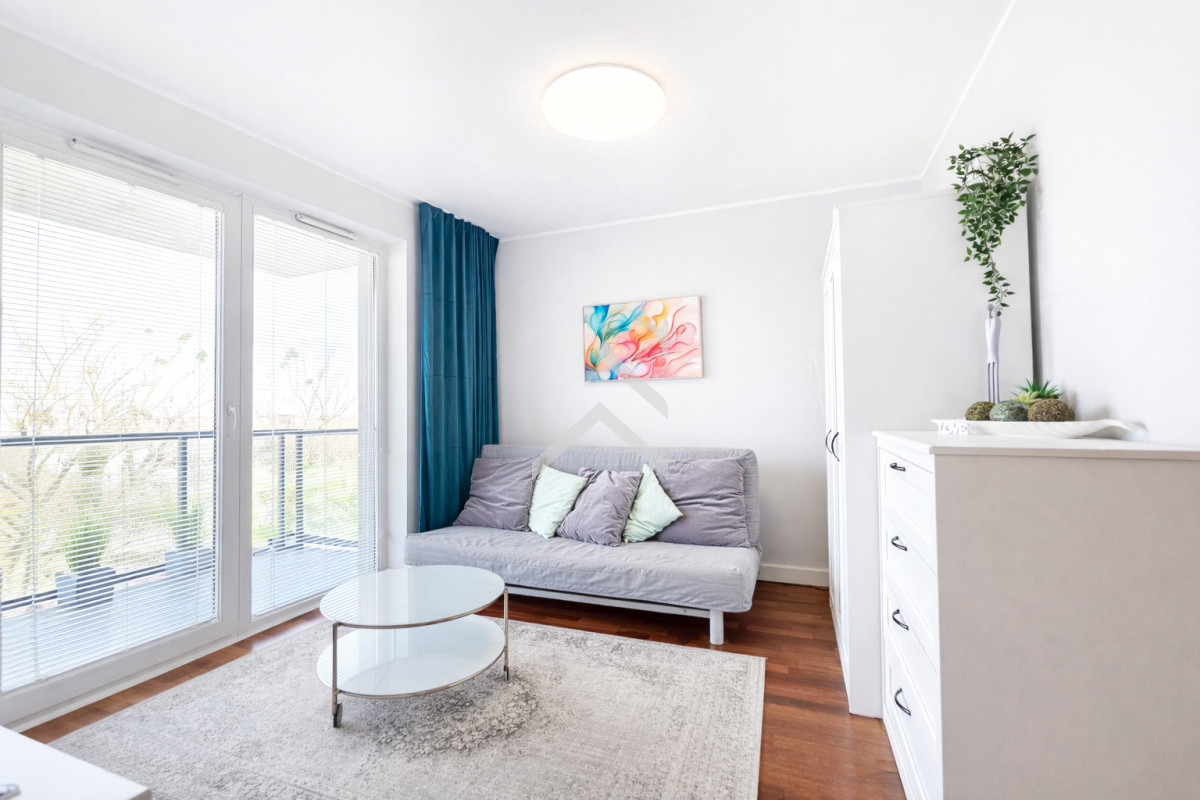 Przestronny salon z dużym oknem i wyjściem na balkon, TV, internet, rozkładana kanapa, szafa, komoda.