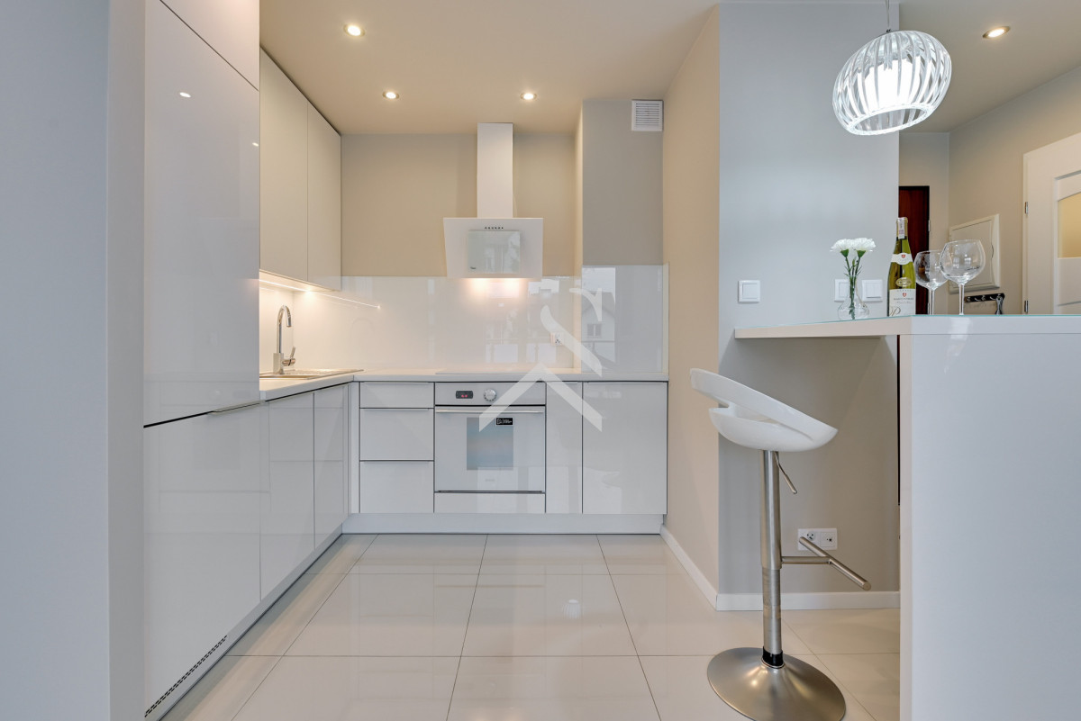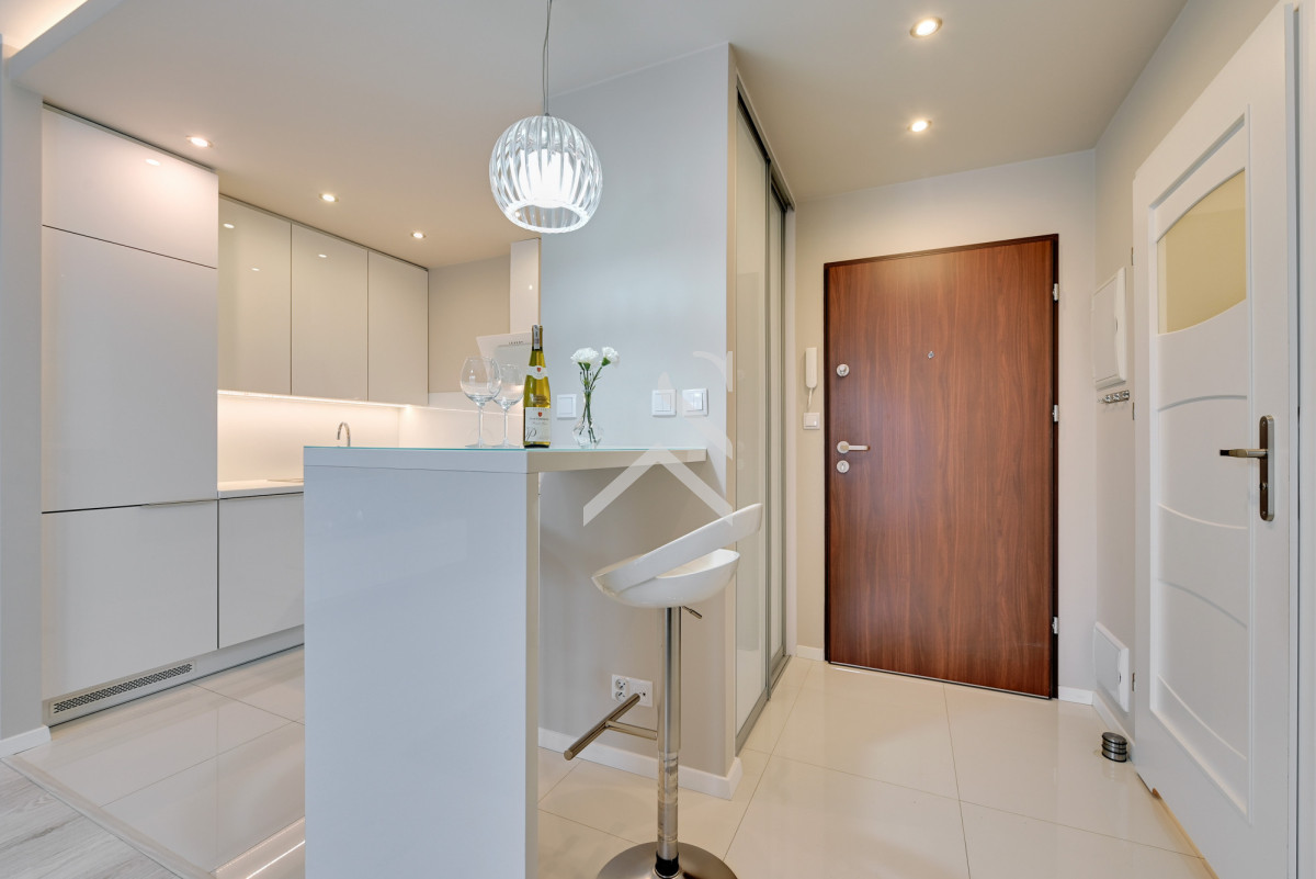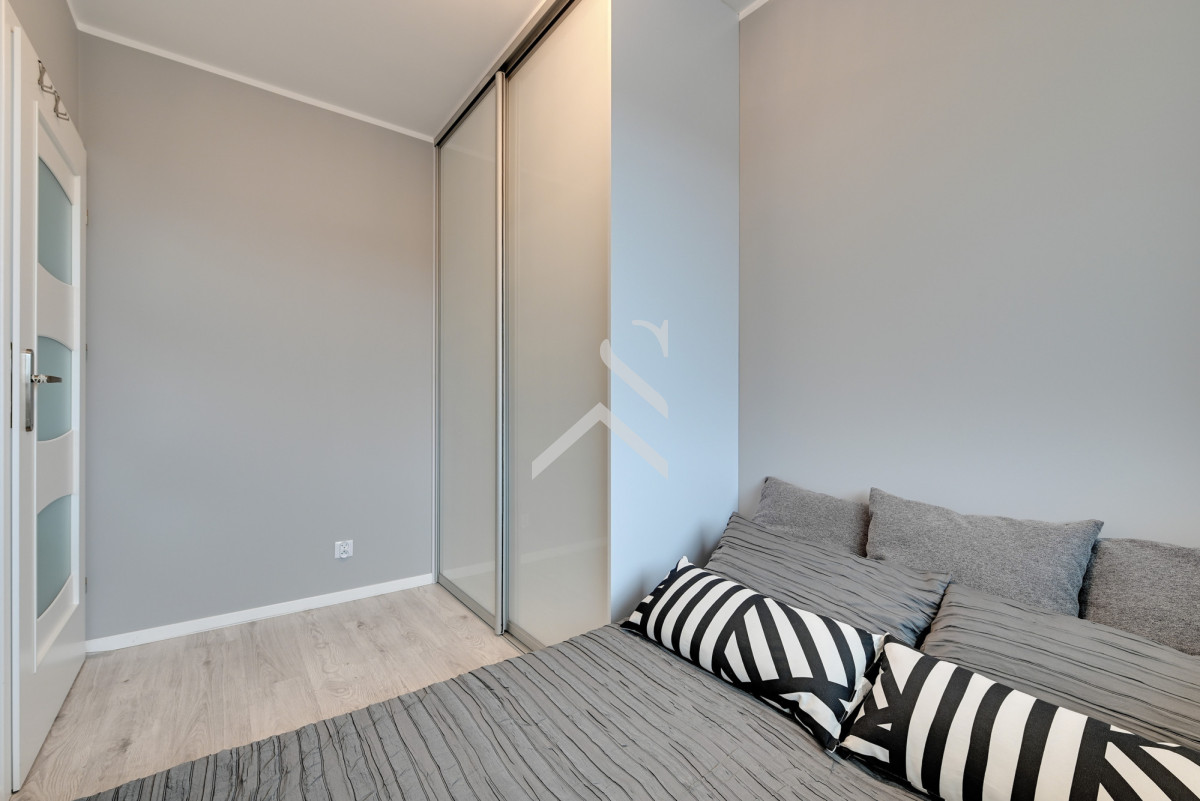 balkon o powierzchni ponad 11 m², sypialnia, łazienka oraz przedpokój. Aneks kuchenny został w pełni wyposażony w sprzęt AGD: zmywarkę, płytę indukcyjną, piekarnik, lodówkę oraz okap. Całość wykończona w nowoczesnym, spójnym stylu, zapewniającym komfort codziennego użytkowania.