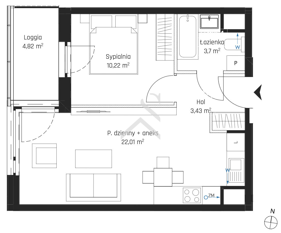 Apartament dwupokojowy w którego skład wchodzi:- salon z aneksem kuchennym (22,01 m²),