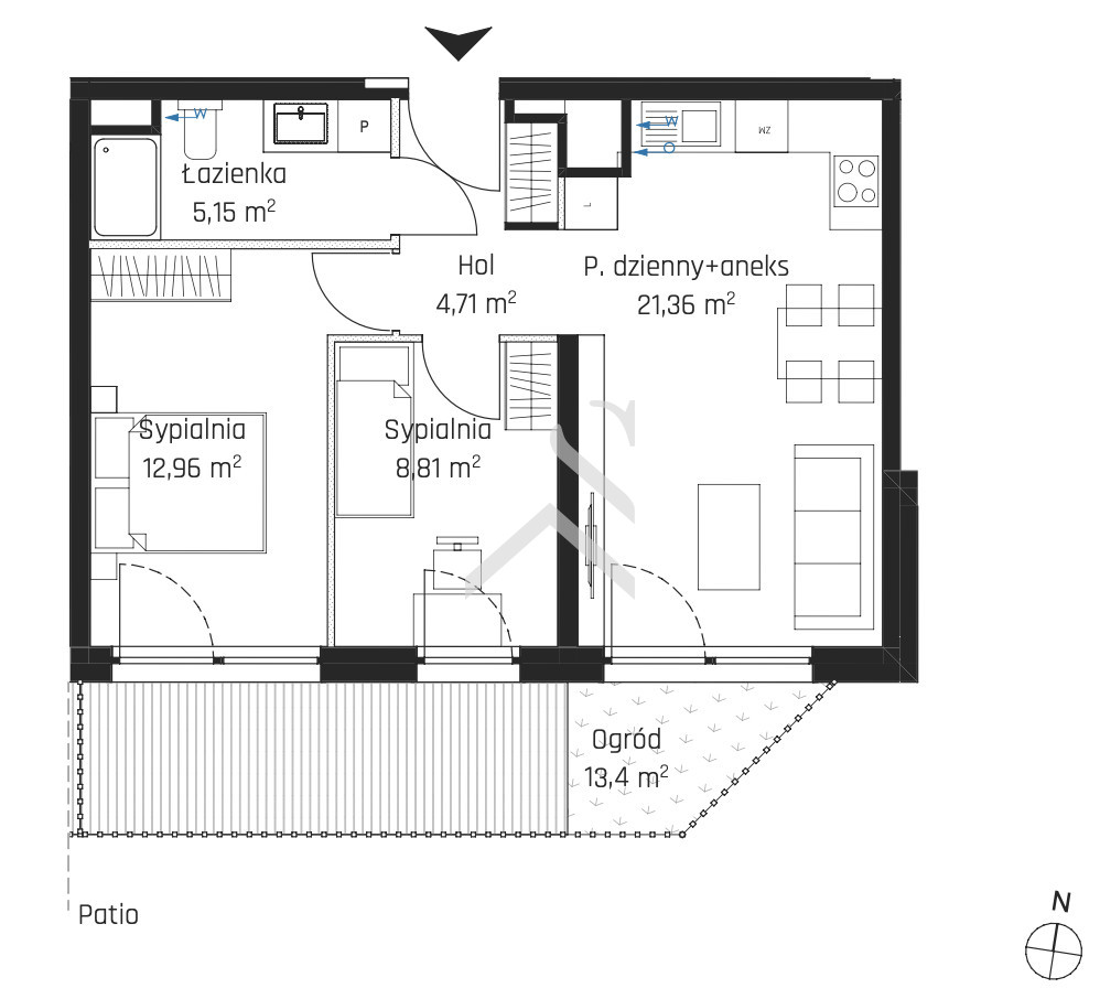 Apartament dwupokojowy w którego skład wchodzi:- salon z aneksem kuchennym (21,36 m²),
