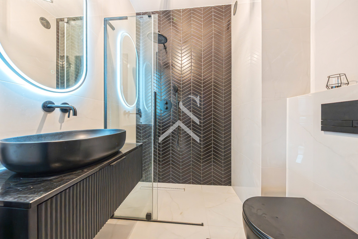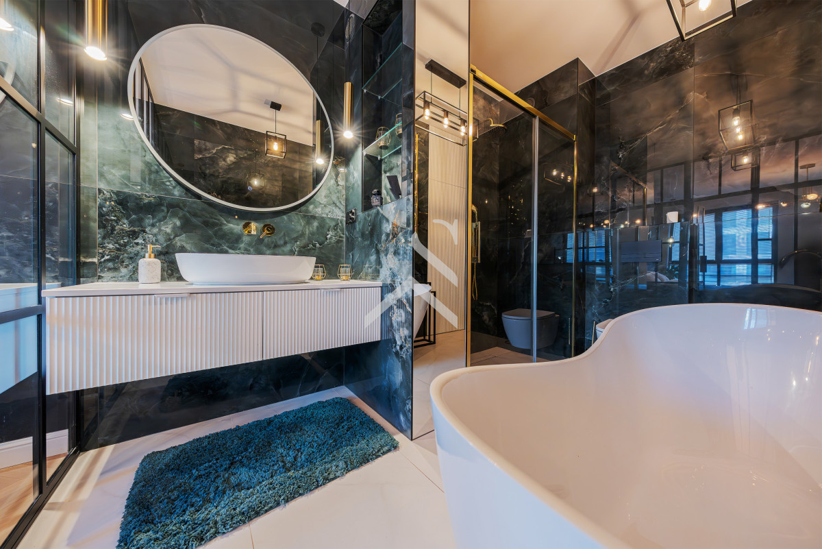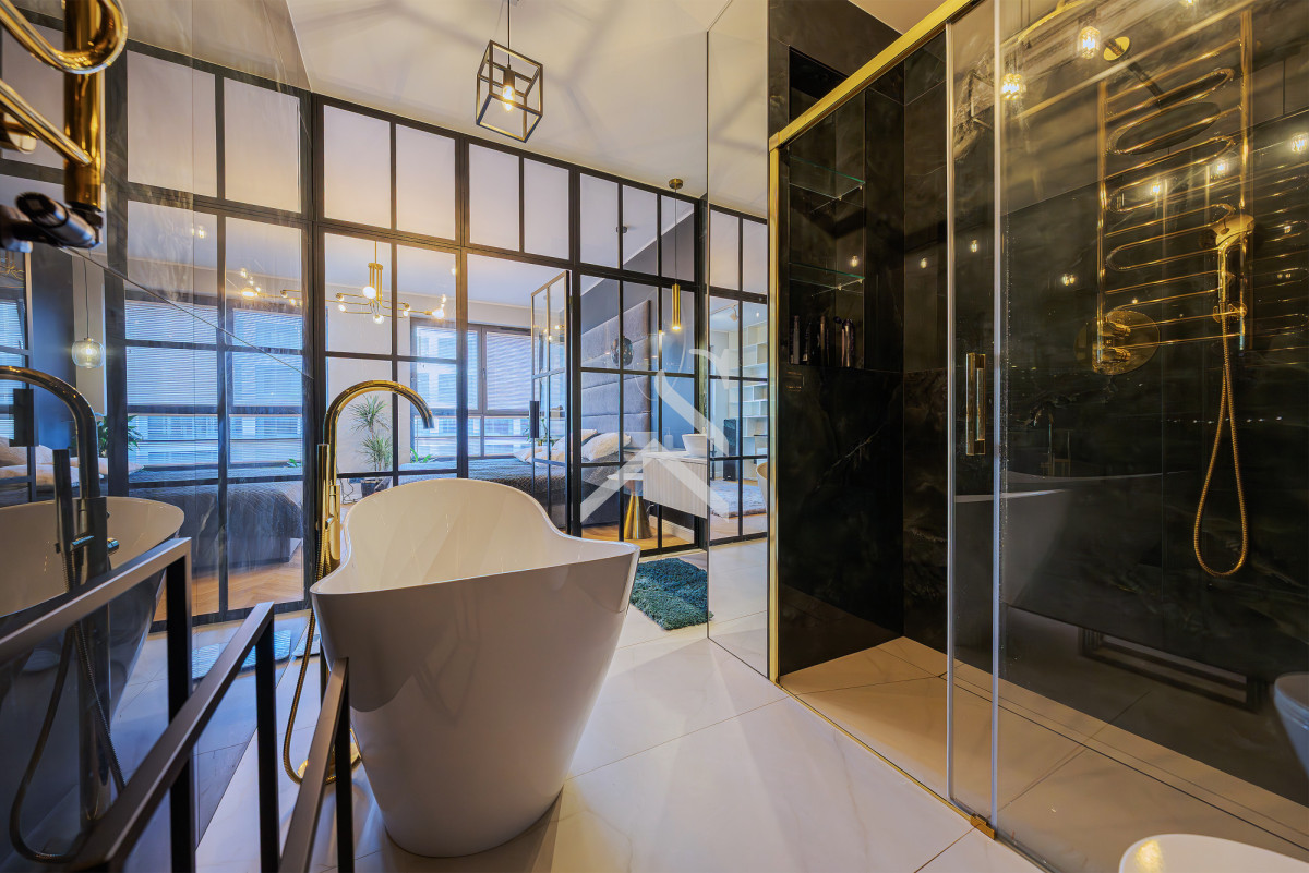 Łazienka, to absolutna perełka tej nieruchomości. Na zdjęciach widać zastosowanie luksusowych materiałów - ciemnych, marmurowych płyt, złotych akcentów i designerskiego oświetlenia. Wolnostojąca wanna o nowoczesnej linii, duże lustro, a także wysokiej klasy ceramika i armatura sprawiają, że przestrzeń ta przypomina prywatne spa.