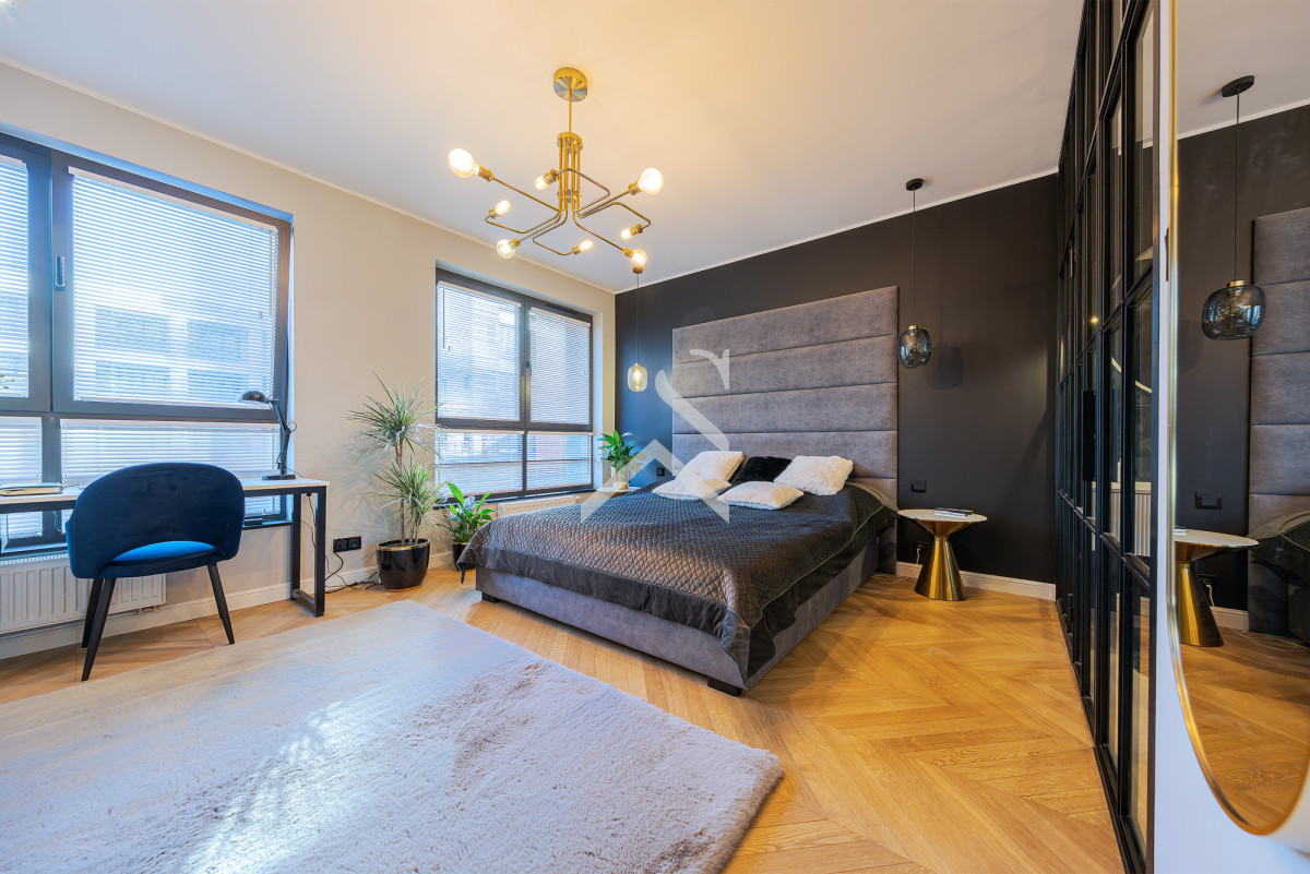 Sypialnia główna to komfortowa, prywatna oaza. Miękkie tapicerowane wezgłowie zajmujące całą ścianę, nastrojowe lampy, duże okna i wydzielone miejsce do pracy tworzą idealną przestrzeń do wypoczynku. Sypialnię oddziela od prywatnej łazienki imponująca, loftowa szklana ściana, dzięki niej oba pomieszczenia zyskują niepowtarzalny charakter.