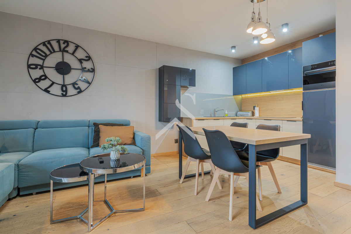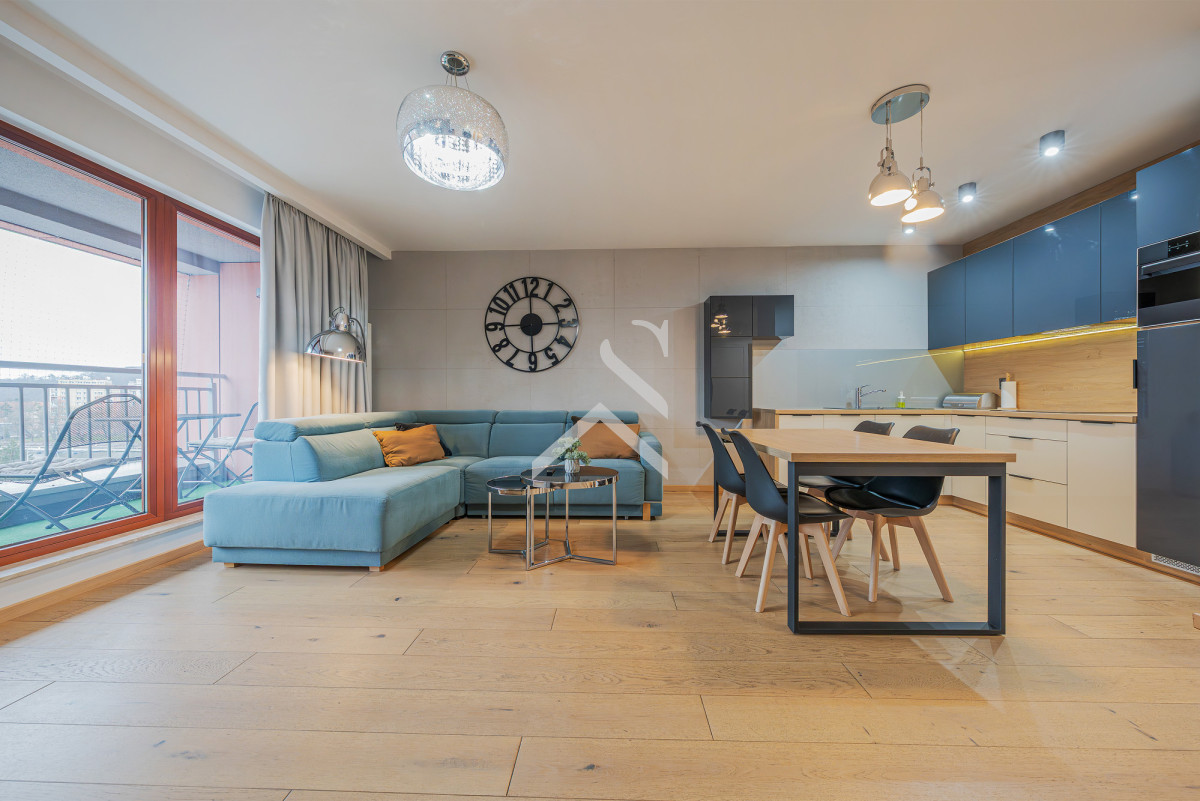 - Przestronny, doskonale doświetlony salon z aneksem kuchennym, stanowiący centralną i reprezentacyjną część mieszkania,