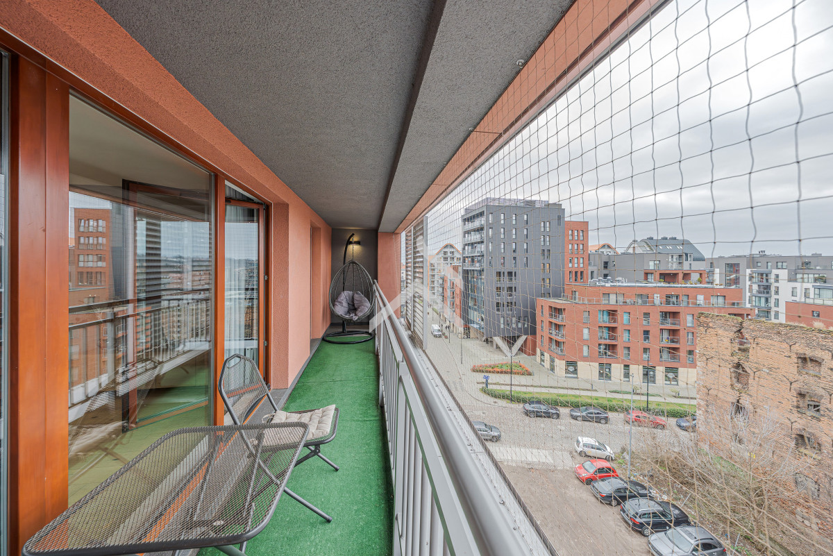 Mieszkanie posiada południową ekspozycję oraz długi balkon biegnący przez całą szerokość apartamentu, z bezpośrednim wyjściem zarówno z przestronnego salonu z aneksem kuchennym, jak i z sypialni. Z balkonu rozciąga się otwarty, nieprzesłanialny widok na Motławę oraz zabytkową ścianę spichlerza z XI - XVIII wieku, objętą ochroną konserwatorską.