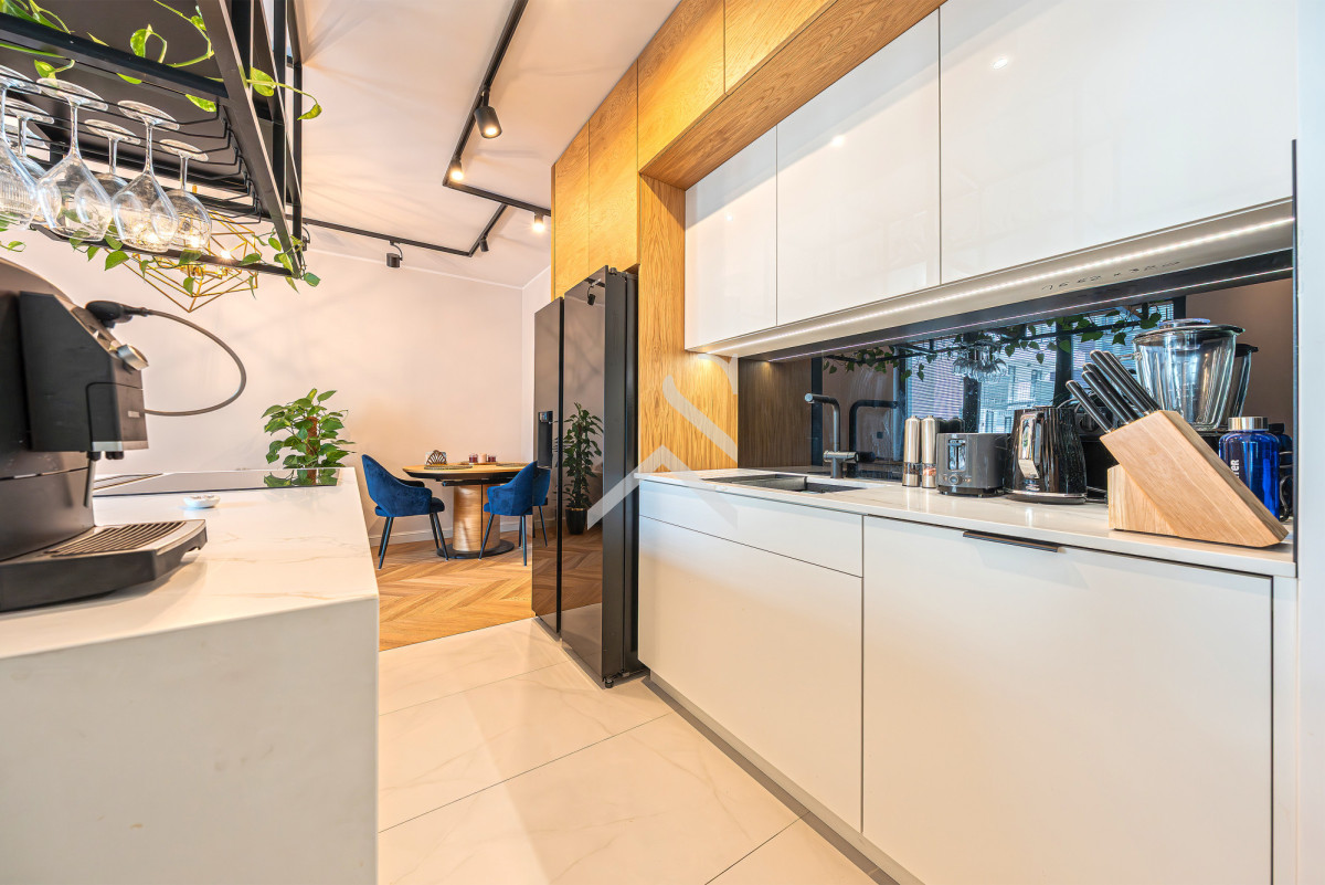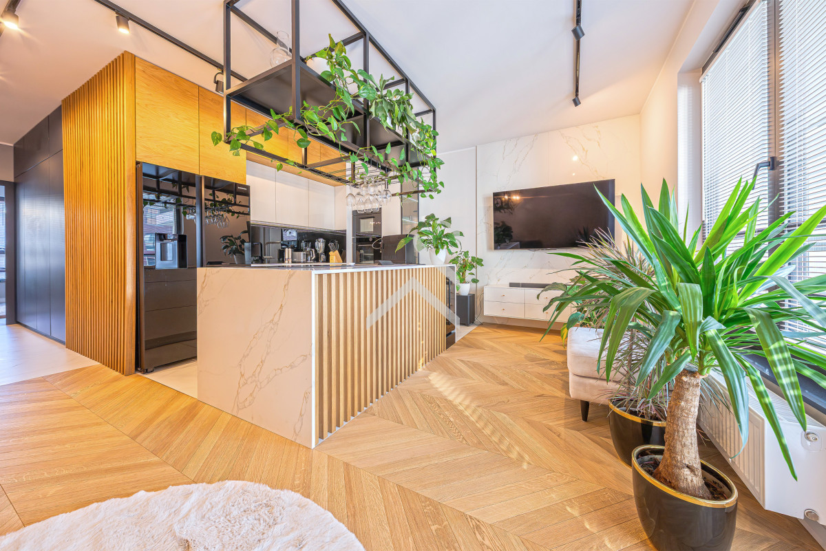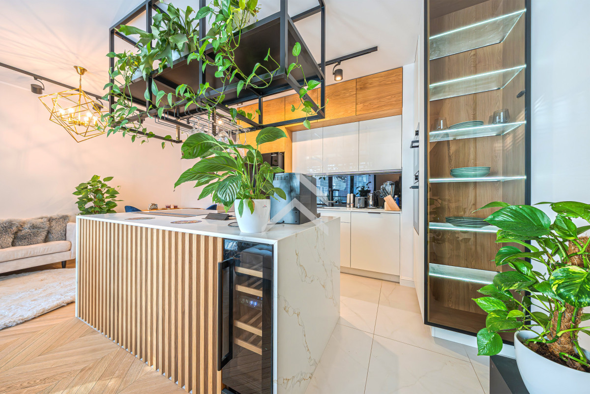 Całość mieszkania została zaprojektowana tak, aby oferować zarówno estetykę, jak i funkcjonalność - od oświetlenia, przez zabudowy, po dodatki i rośliny, które nadają wnętrzu naturalnej energii.