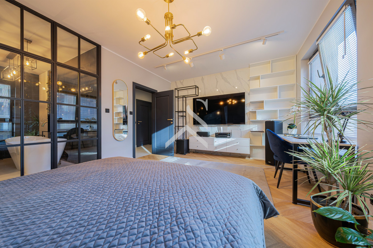 Sypialnia główna to komfortowa, prywatna oaza. Miękkie tapicerowane wezgłowie zajmujące całą ścianę, nastrojowe lampy, duże okna i wydzielone miejsce do pracy tworzą idealną przestrzeń do wypoczynku. Sypialnię oddziela od prywatnej łazienki imponująca, loftowa szklana ściana, dzięki niej oba pomieszczenia zyskują niepowtarzalny charakter.