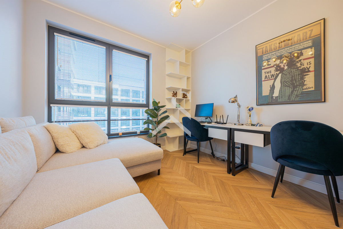 Dodatkowy pokój pełni obecnie funkcję komfortowego gabinetu oraz miejsca do relaksu. Duże okno zapewnia doskonałe doświetlenie przestrzeni, tworząc idealne warunki zarówno do pracy, jak i odpoczynku. Wnętrze wyposażono w wygodny narożnik oraz biurko z miejscem dla dwóch osób.