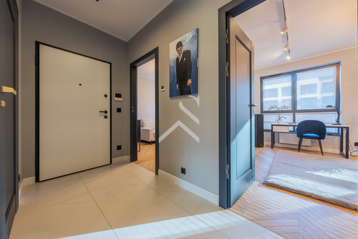82,6 m², położone na III piętrze, zachwyca spójną i dopracowaną aranżacją. Już od progu widać konsekwencję stylu, wielkoformatowe kafle, elegancką jodełkę na podłodze, starannie zaprojektowane zabudowy oraz połączenie matowych i połyskujących powierzchni.