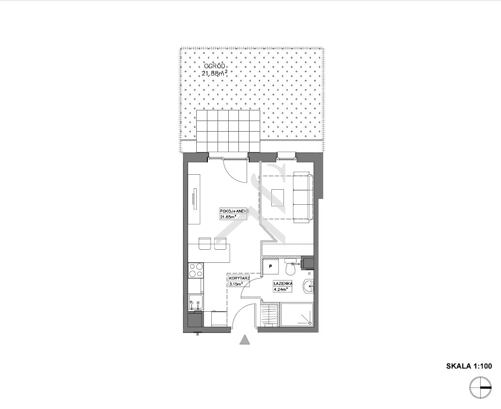 - pokój z aneksem kuchennym z wyjściem na ogródek,