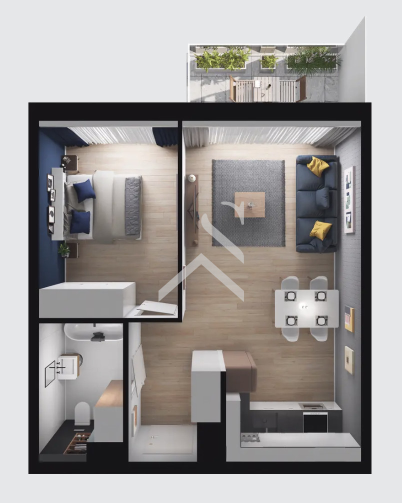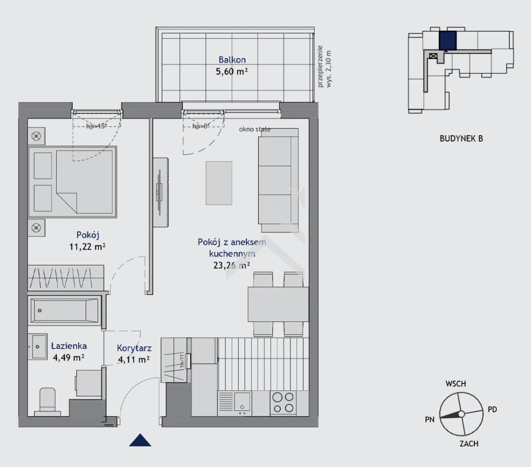 W skład mieszkania wchodzi: - salon z aneksem kuchennym (23,26 m²),