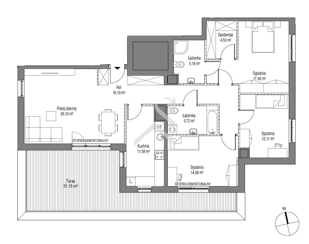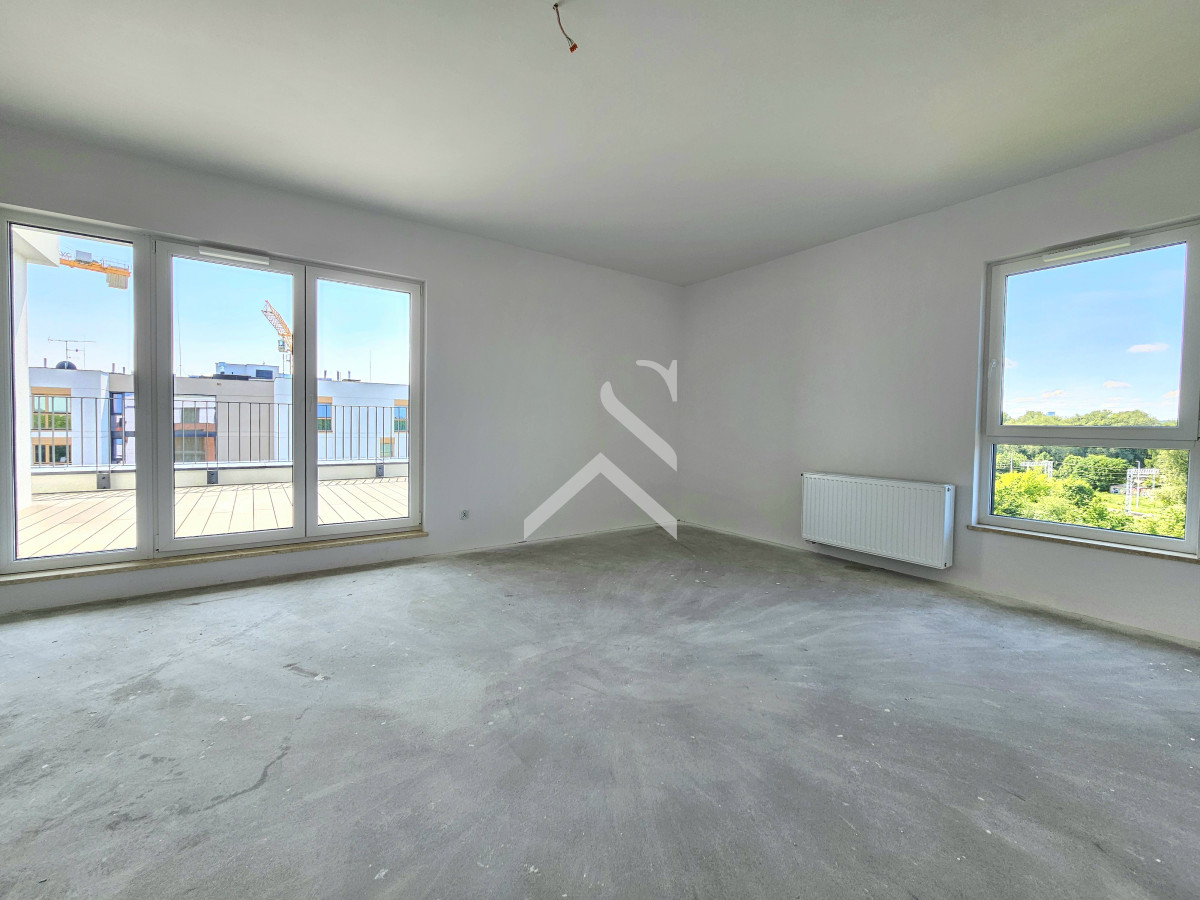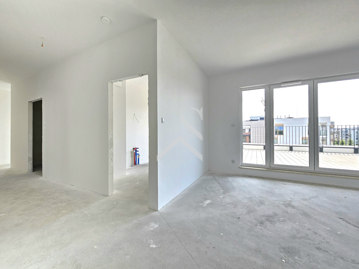 W mieszkaniu znajdują się 4 niezależne pokoje, z największego pokoju oraz z sypialni wyjście na taras 31m2, osobna kuchnia, dwie łazienki, garderoba.