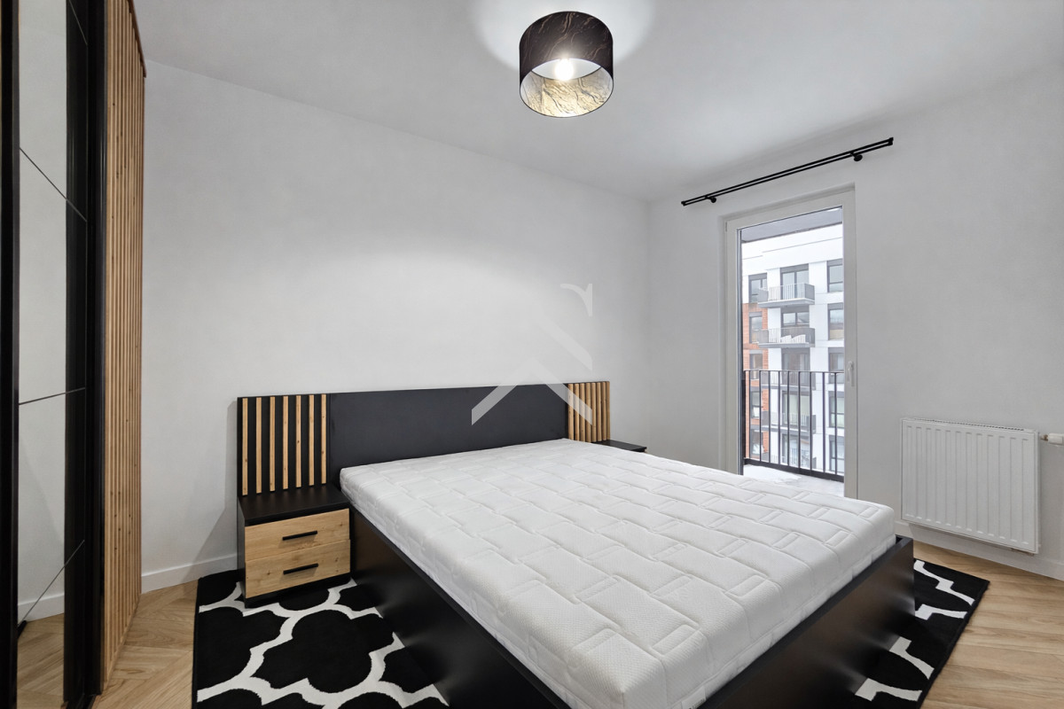 - Sypialnia z wyjściem na balkon, zostanie wyposażona w łóżko sypialniane, w dwie szafki nocne oraz szafę na wymiar.